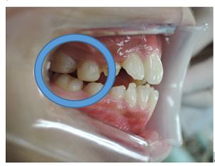 当矯正歯科医院では上顎の乳臼歯にレジンを盛る事で、クロスした前歯の被蓋(前歯の咬み合わせ)を改善していきます。
