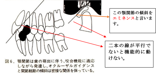 下に示す図は、顎関節と上顎前歯の傾斜関係が2本の平行線により表されています。