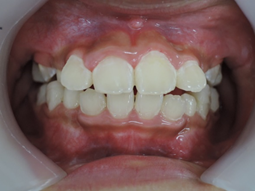 当矯正歯科医院では上顎の乳臼歯にレジンを盛る事で、クロスした前歯の被蓋(前歯の咬み合わせ)を改善していきます。