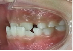 乳臼歯にレジンを盛る事で第一大臼歯の咬み合わせに隙間が出来ました。